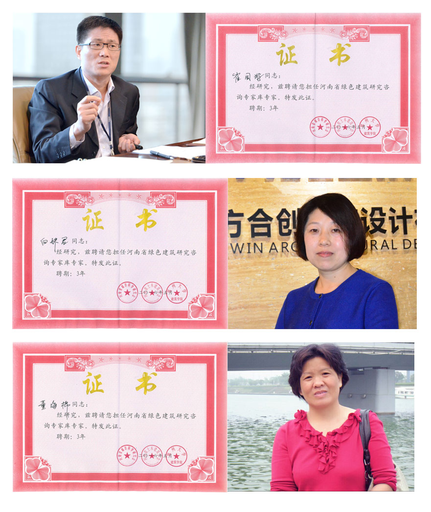 河南省绿色建筑研究咨询专家库由建筑工程领域从事绿色建筑设计、技术研究、开发、应用和管理,在业界有一定权威性的高端人才组成。专家征集工作在各有关单位的大力支持下,行业内报名踊跃,根据工作计划,按照初核、复审、审定、公示四个阶段。经过为期两个月的评定工作,在全省范围内共评选出包括河南省建筑科学研究院有限公司、中建(郑州)城市开发建设有限公司、河南省建筑科学研究院、河南中建工程设计咨询有限公司、河南五方建筑设计有限公司、郑州大学等20余家企事业单位、公司的52名专家。五方设计董事长兼总经理崔国游、电气总工程师白姝君、主任工程师董海棉,正式入选第一批河南省绿色建筑研究咨询专家库。